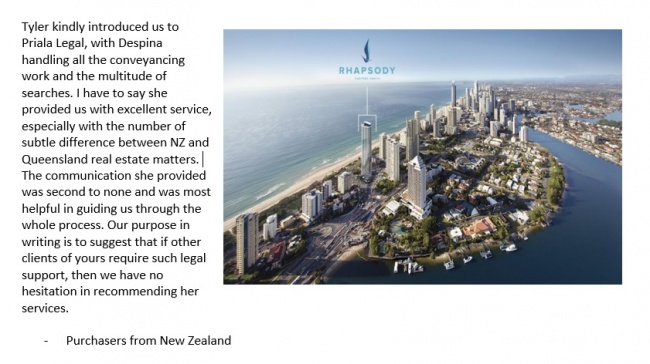 "Tyler kindly introduced us to Priala Legal, with Despina handling all the conveyancing work and the multitude of searches. I have to say she provided us with excellent service, especially with the number of subtle difference between NZ and Queensland real estate matters. The communication she provided was second to none and was most helpful in guiding us through the whole process. Our purpose in writing is to suggest that if other clients of yours require such legal support, then we have no hesitation in recommending her services."